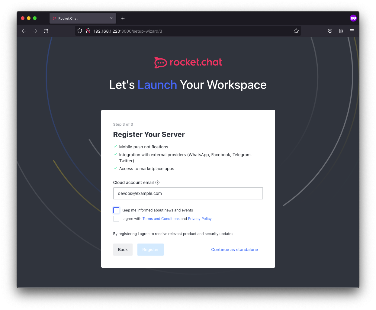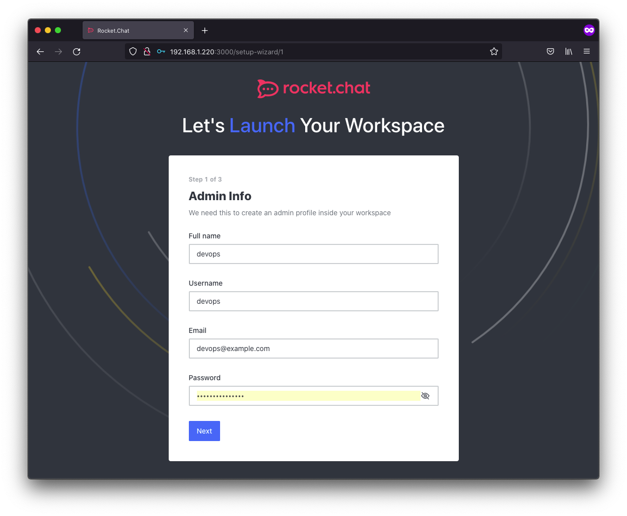 We can make use of the official Docker image available for Rocket.chat. The application itself just needs a MongoDB database to get up and running and in the context of Kubernetes, that means creating a StatefulSet, for which we will also configure a volume claim to persist data for the application. Applying the rocketchat.yaml file will create a number of resources, namely the namespace, the service for the MongoDB, the statefulset again for the MongoDB, the deployment, as well as the service for the application itself.