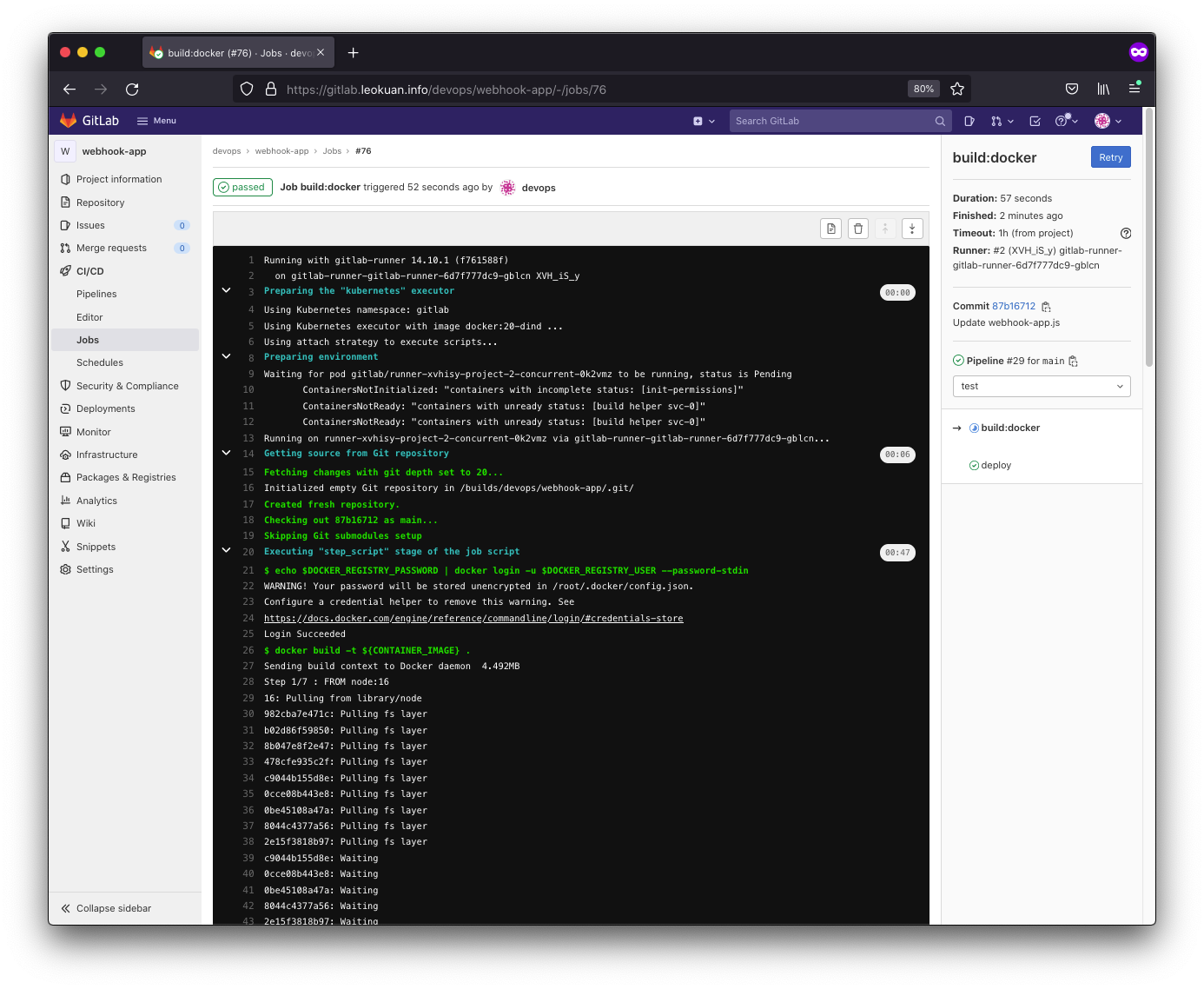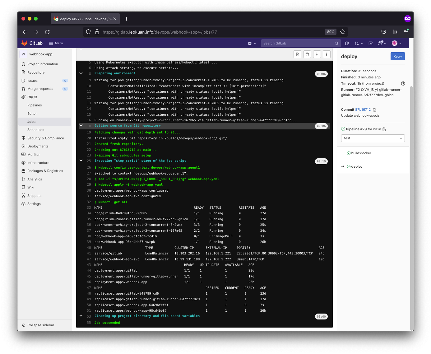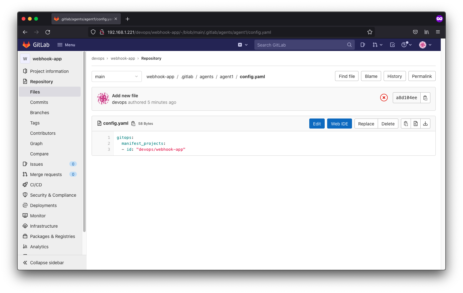 Now that we have both our runner and agent set up, we can then create our webhook-app.yaml file which contains the manifest for our webhook-app’s deployment and service. Then we can move on to the .gitlab-ci.yml to define our pipeline.