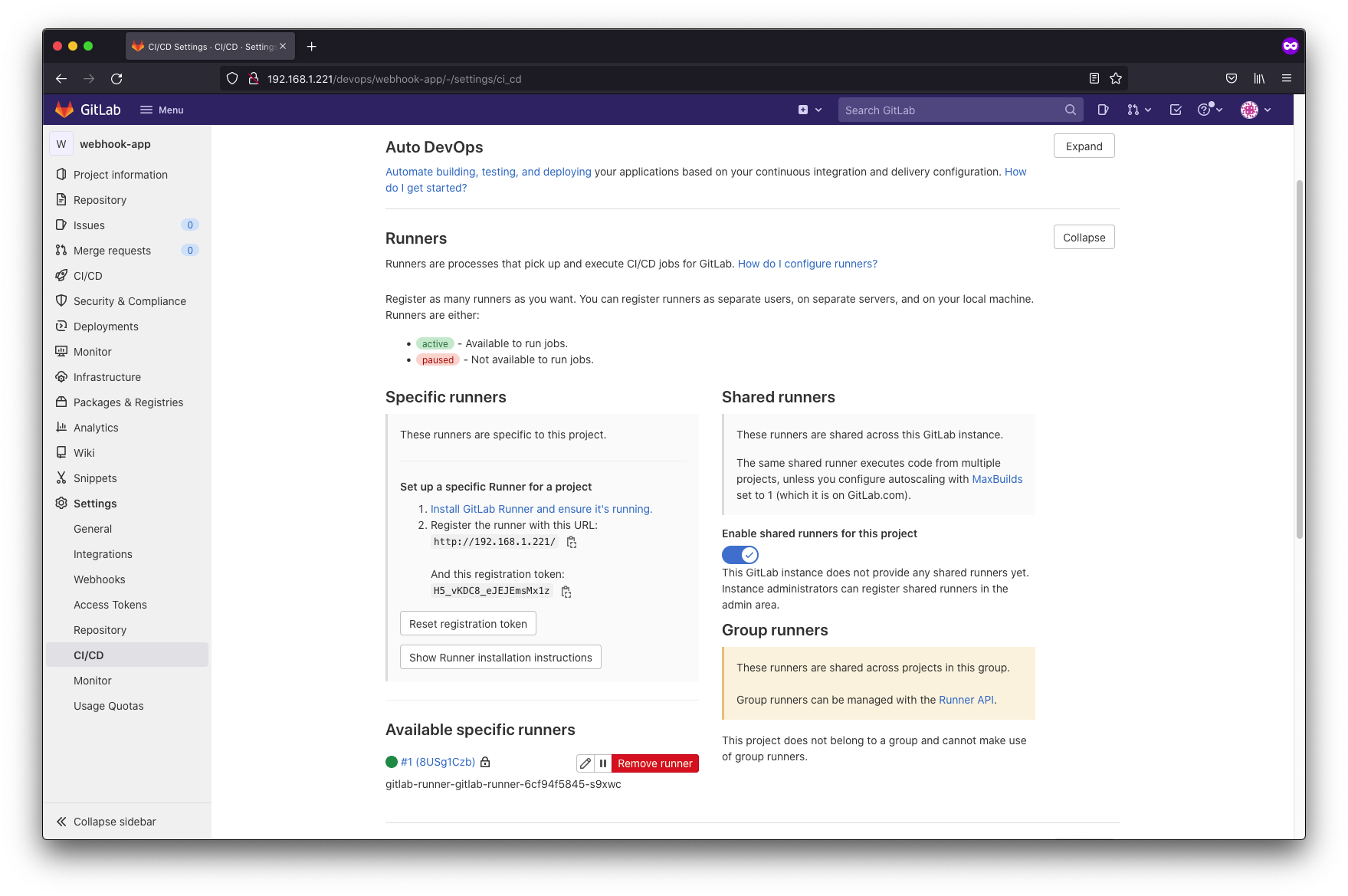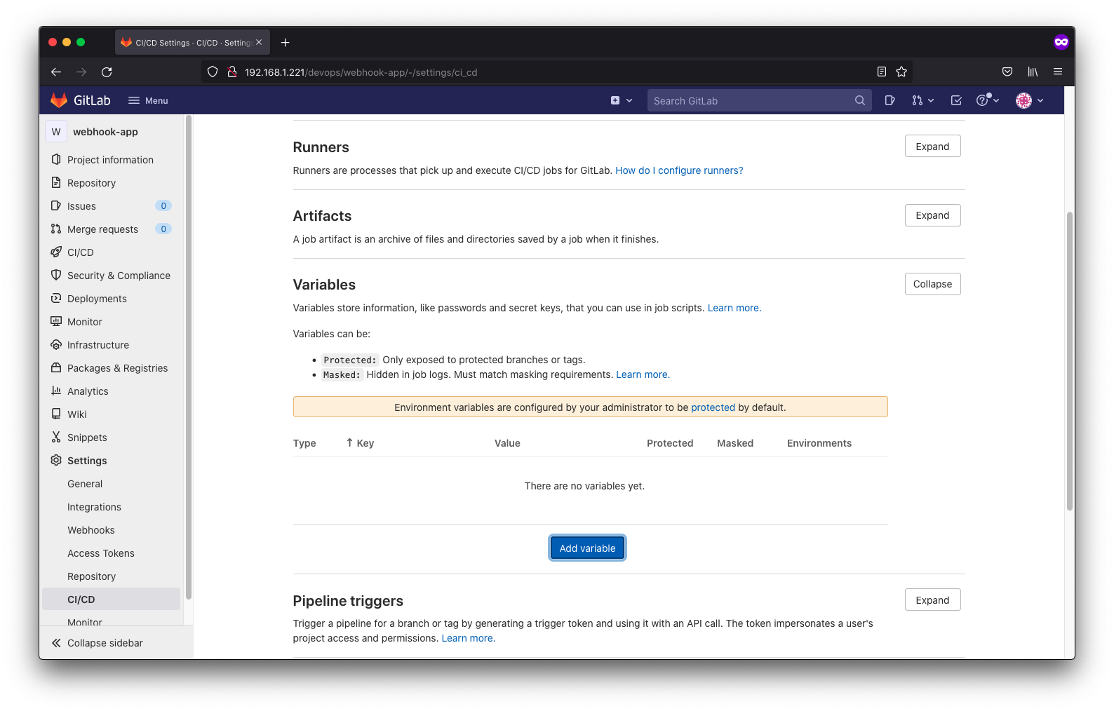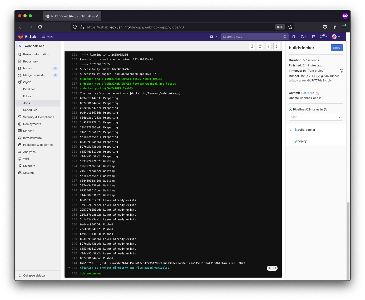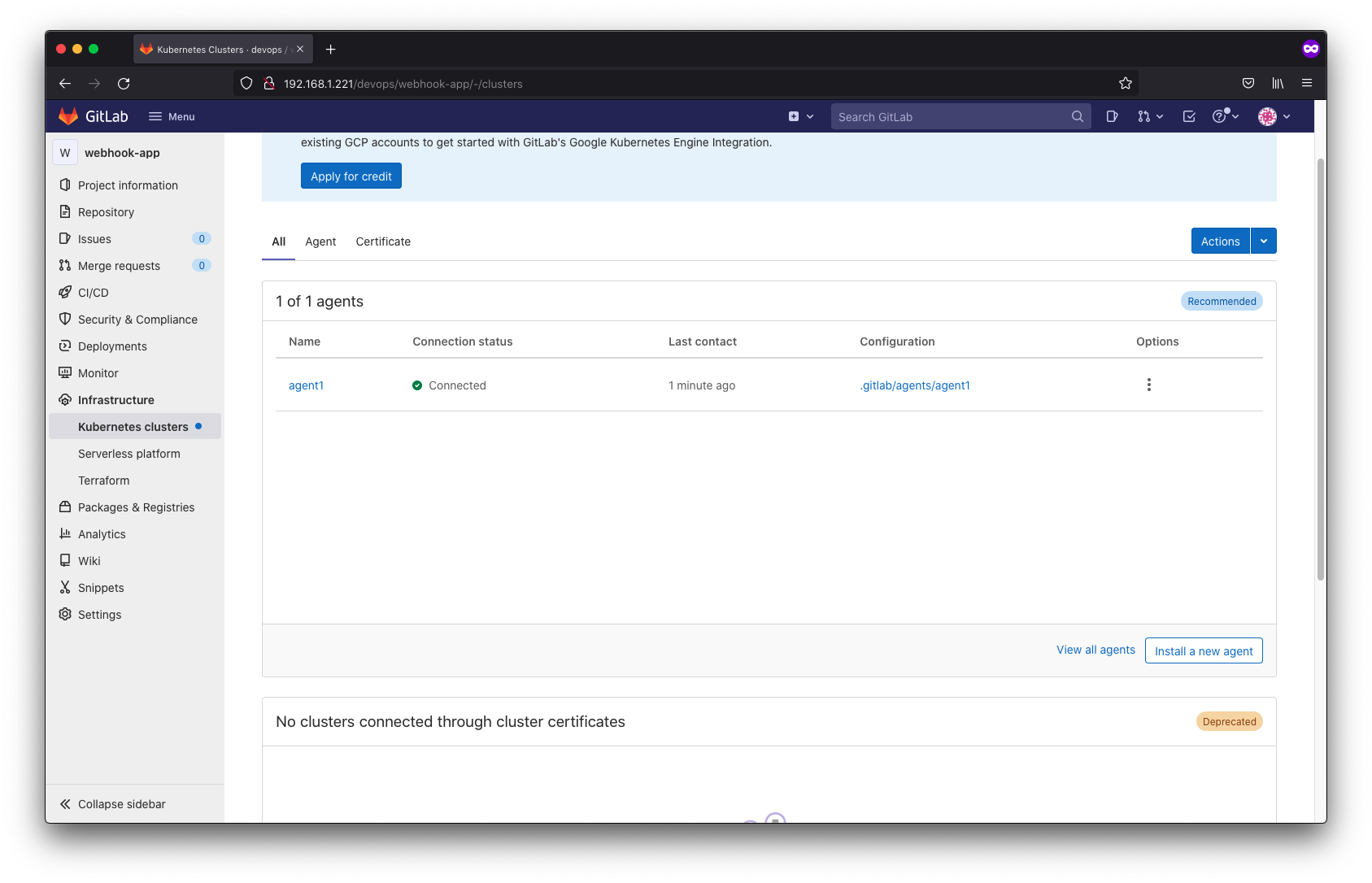 Now that we have both our runner and agent set up, we can then create our webhook-app.yaml file which contains the manifest for our webhook-app’s deployment and service. Then we can move on to the .gitlab-ci.yml to define our pipeline.