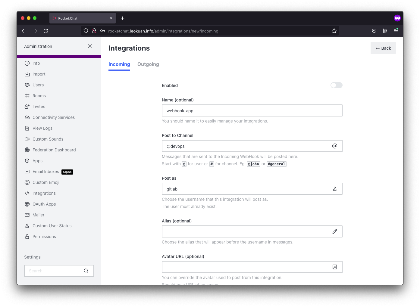 first I set up a new bot account called gitlab. Then Under integrations, I created a new incoming webhook.