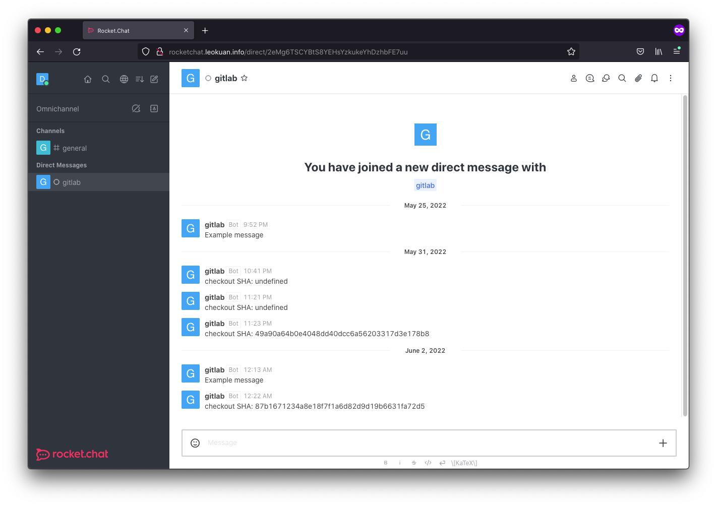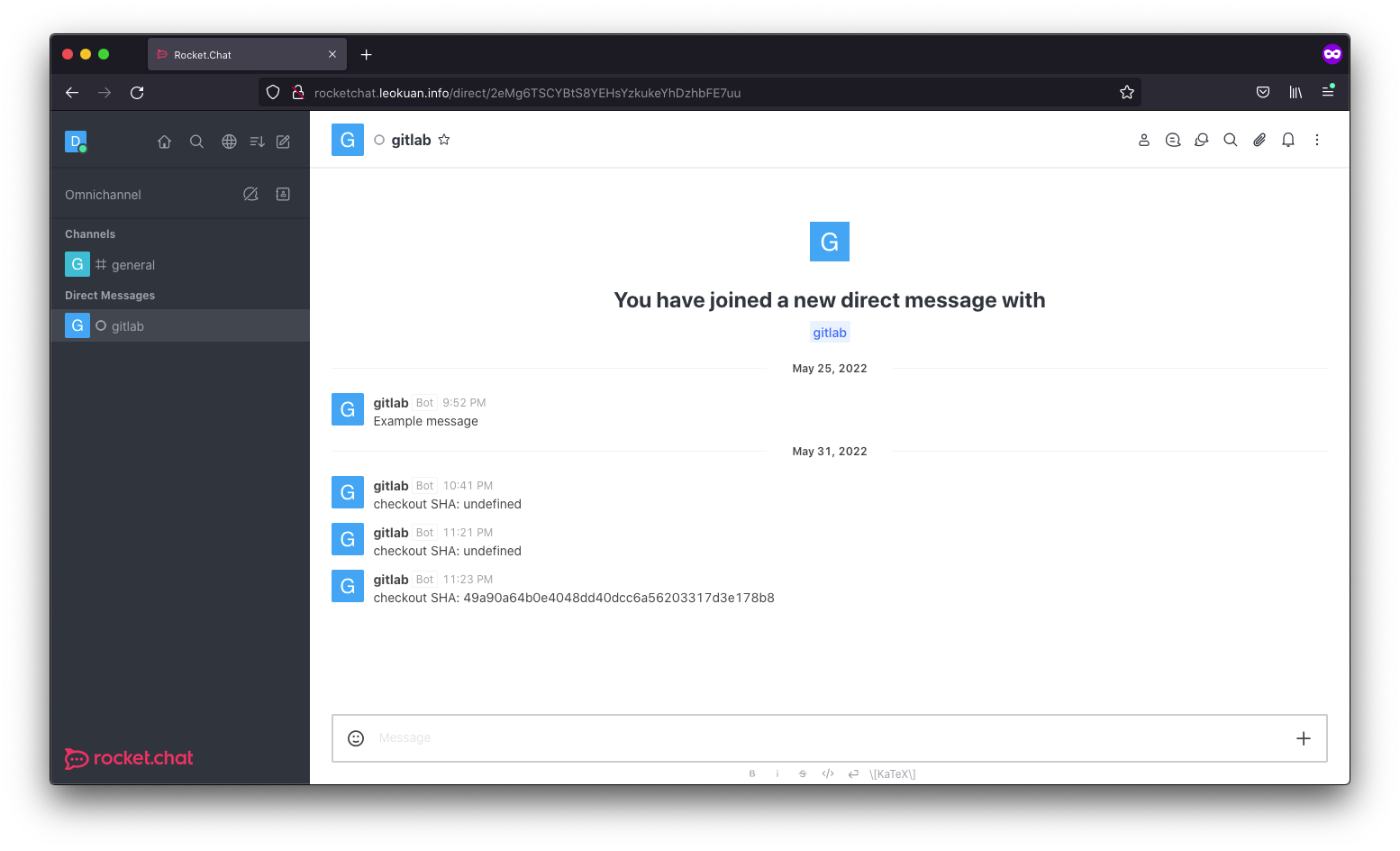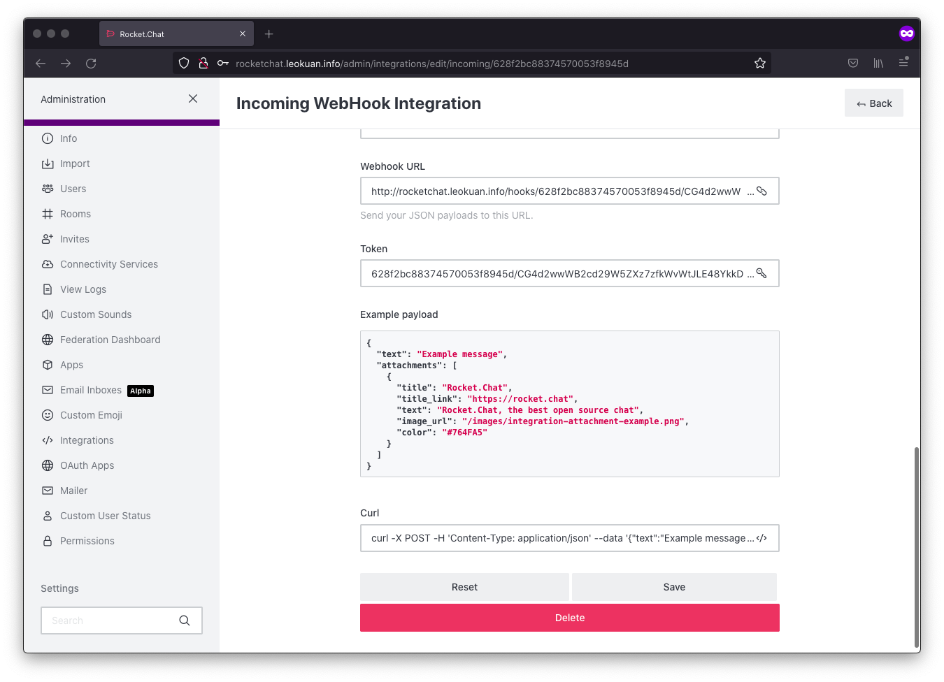 devops@k8s-master:~$ curl -X POST -H 'Content-Type: application/json' --data '{"text":"Example message"}' http://rocketchat.leokuan.info/hooks/628f2bc88374570053f8945d/CG4d2wwWB2cd29W5ZXz7zfkWvWtJLE48YkkDwCBvoduoczgE